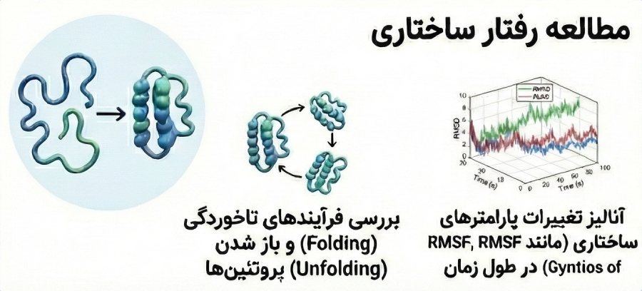 در بخش «مطالعه رفتار ساختاری»، تغییرات پارامترهای مهمی مانند RMSD، RMSF و شعاع ژیراسیون (Radius of Gyration) در طول زمان آنالیز میشوند. همچنین فرآیندهای تاخوردگی (Folding) و باز شدن (Unfolding) پروتئینها قابل بررسی است.